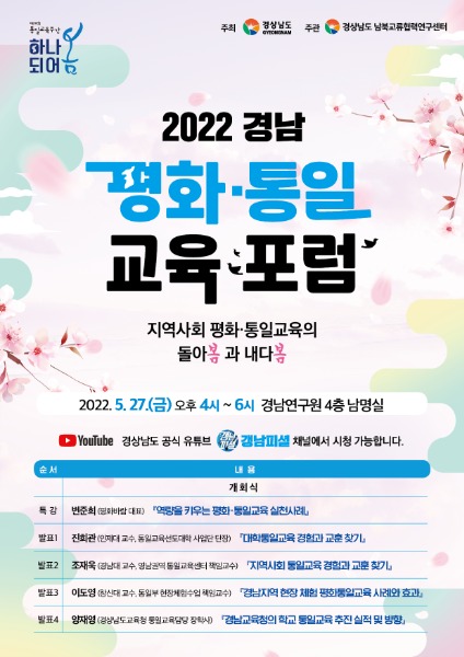 경상남도는 제10회 통일교육주간을 맞아 오는 27일 경남연구원 4층 남명실에서 ‘2022년 경남 평화통일교육포럼’을 개최한다고 밝혔다.