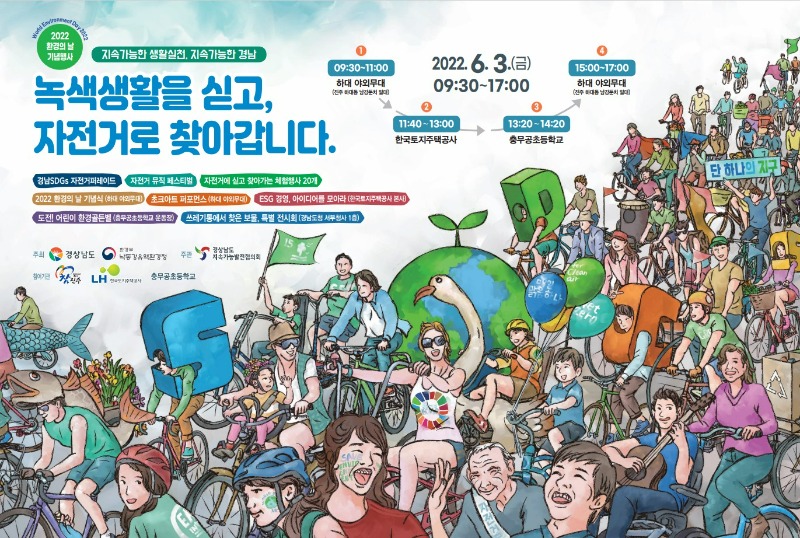 경남도와 낙동강유역환경청은 제27회 환경의 날(6.5)을 맞아 오는 6월 3일 진주 남강변 하대동 야외무대 일원에서 환경의 날 기념식, 경남SDGs(Sustainable Development Goals:지속가능한 발전 목표) 실천 자전거 행진, 자전거 음악 축제와 함께 다양한 환경체험 행사를 개최한다.