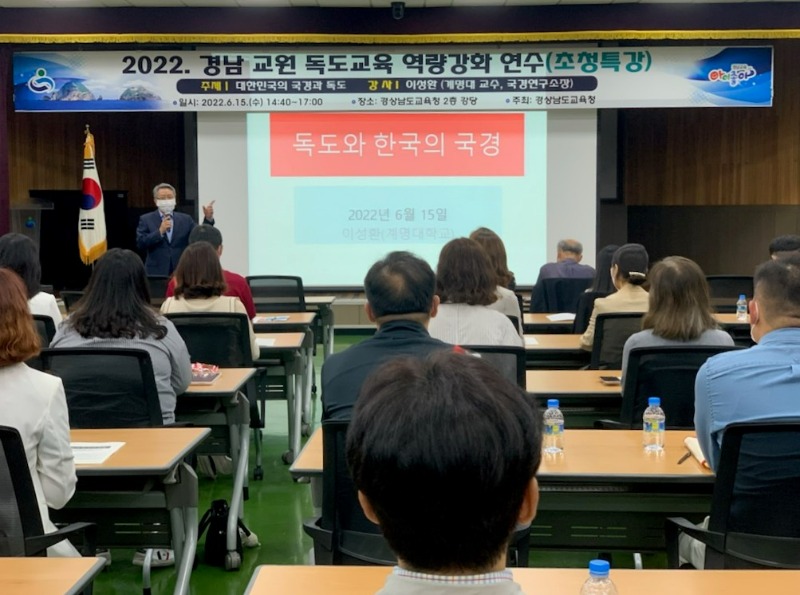 경상남도교육청(교육감 박종훈)은 15일 오후 본관 2층 강당에서 초·중·고등학교 역사·독도 교육 담당 교원 50여 명을 대상으로 독도 교육 전문가를 초청해 특강을 진행했다.