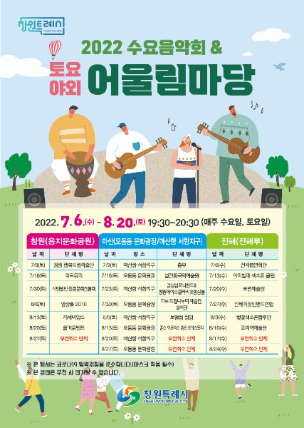 창원특례시가 주최, 주관하는 2022 수요 및 토요 야외 음악회는 7~8월 동안 창원지역 민간예술단체들의 다채롭고 정성스러운 무대들로 준비되어 있으며, 매주 수요일에는 진해루, 매주 토요일은 창원용지문화공원, 그리고 마산항 서항지구와 오동동문화광장에서는 격주 토요일마다 공연이 열릴 예정이다.