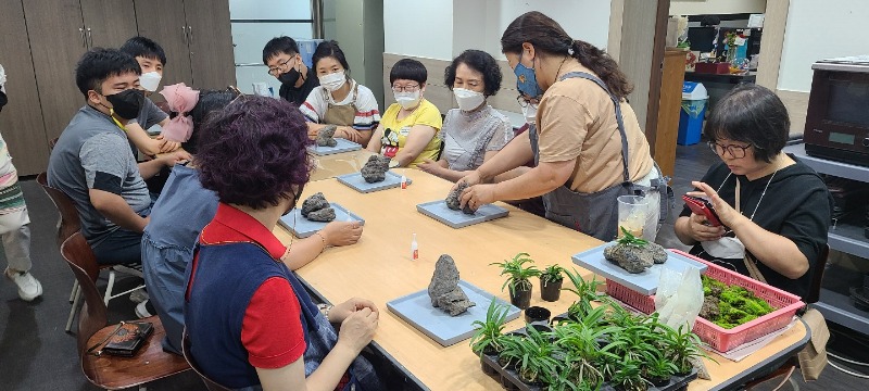 오늘 경남장애인문화센터 에서는 원예치료 프로그램 시간에 돌 위에 풍란을 심어 자연미를