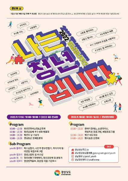 경상남도는 제3회 청년의 날을 맞아 17일부터 18일까지 2일간 창원컨벤션센터와 경남청년센터에서 ‘경남청년주간 행사’를 개최한다.