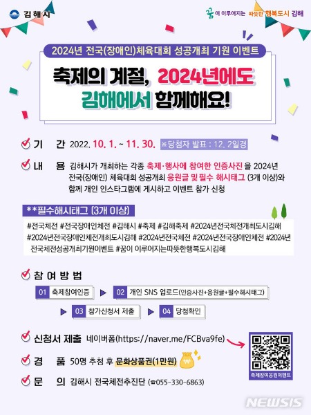 [김해=뉴시스] 김상우 기자 = 경남 김해시는 ‘2024년 전국(장애인)체전 성공개최 기원 SNS 이벤트’를 진행한다고 29일 밝혔다.