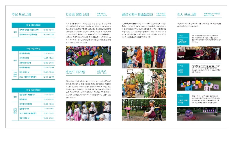 이외에도 어린이 문화축제의 일환인 어린이 중고장터, 인형극 및 체험 프로그램, 밀양 무형문화재를 활용한 창작 뮤지컬 연(蓮)·애(愛)·몽(夢) 공연 등 다양한 프로그램이 준비되어 있다. 또한 그동안 발매된 여러 아리랑 음원들을 시대순과 아티스트 창작곡으로 분류한 소리 전시 소리랑 아리랑, 밀양의 문화와 아리랑 테마글자를 구(球) 형태의 스틸 조형물에 새긴 작품 전시 둥글고 둥글게 아리랑을 밀양강을 바라보면서 편안하게 감상할 수 있다.