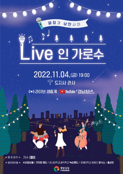 아울러, 경남청년 콘서트 ‘Live 인 가로수’는 유튜브 「경남청년」을 통해 실시간 생중계 된다.