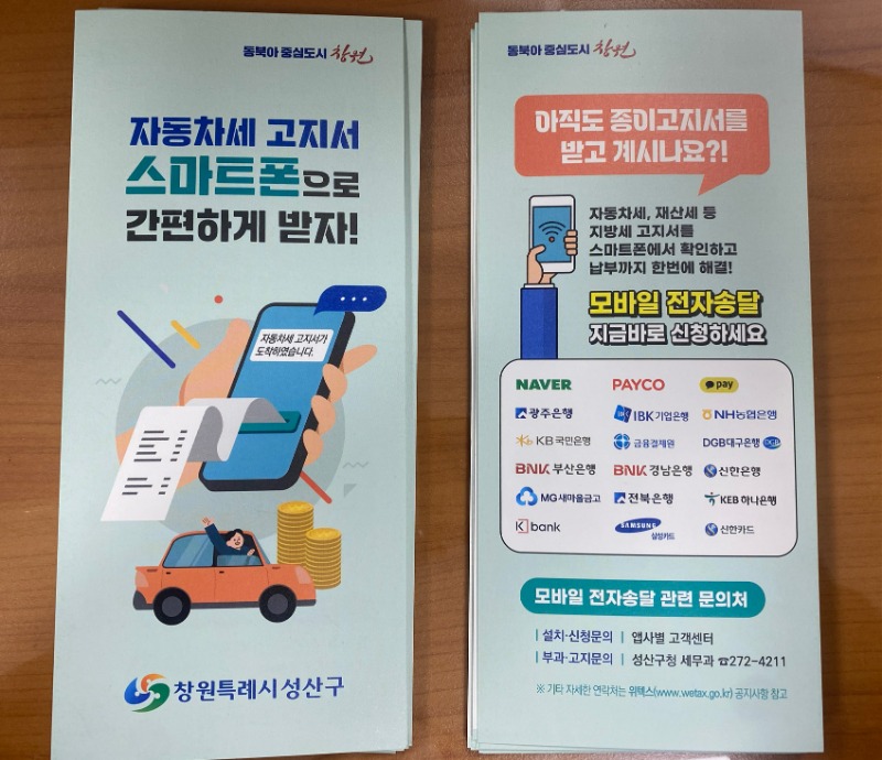 창원특례시 성산구(구청장 장규삼)는 지방세 모바일 전자송달 홍보 리플릿을 제작하여, 이번 12월 2기분 자동차세 종이고지서 송달 대상자들에게 함께 발송하여 집중 홍보할 예정이라고 29일 밝혔다.