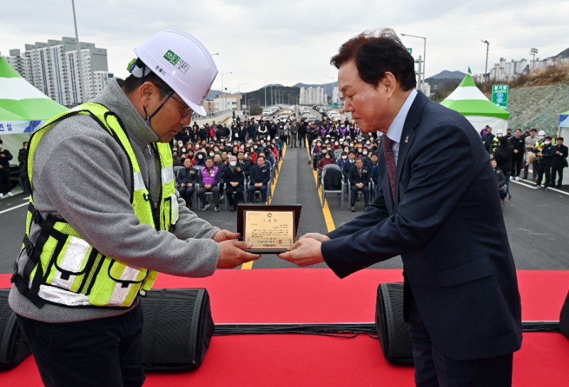 이날 준공식은 박완수 경상남도지사를 비롯해 대한노인회 동읍분회장, 이장협의회장 및 주민자치회장 등 지역 주민 300여 명이 참석한 가운데 사업추진 경과보고, 유공자 표창 수여, 테이프 커팅식, 도로 시승 순으로 진행됐다.