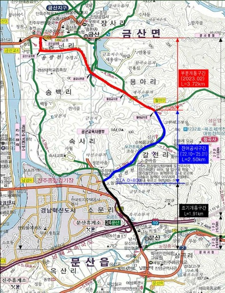 경상남도(도지사 박완수)는 ‘문산-금산교 간 도로 확・포장공사’ 구간 중 시공이 완료된 진주시 금산면 용아리 월아삼거리부터 중천리 금산교차로 구간 3.72㎞를 21일 오전 10시부터 부분 개통한다고 밝혔다.