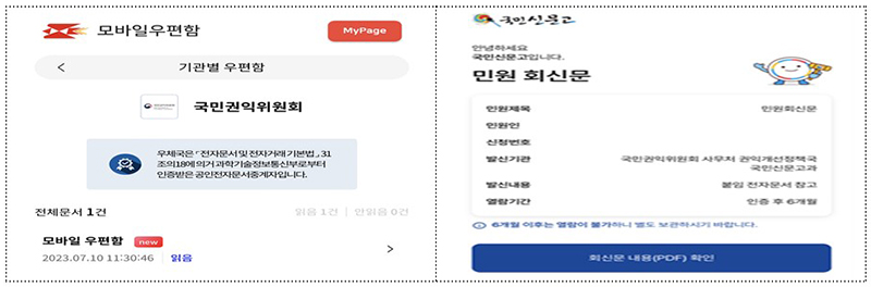 한편 서면 답변을 전자문서로 받아보기 위해서는 모바일우편함 앱을 설치·가입하고 국민신문고에서 휴대전화 등으로 본인인증을 해야 한다.