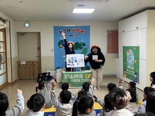 경상남도환경재단은 5일 김해서부어린이집(김해시 전하동 소재)에서 유아 및 학부모 30여 명이 함께 참여한 가운데 영어를 접목한 탄소중립교육을 진행했다고 밝혔다.
