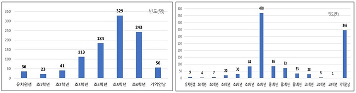 구체적으로 초등학생의 경우 초등학교 5학년(32%, 329명)에 이어 초등학교 6학년(24%, 243명), 초등학교 4학년(18%, 184명) 순이었다.