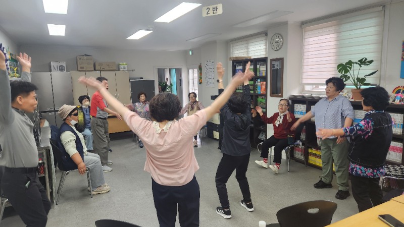 경남조은장애인평생학교 학생들은 1교시 한문 수업 후 2교시 밸런스워킹 시간에 음악에 맞춰 다양한 동작을 실시해봅니다. 다양한 맞춤박수로 기억을 하면서 쳐야하는 박수이기 때문에 두뇌운동에도 도움이 되었으며 의자를 잡고 다양한 하체강화운동을 해봅니다. 의자를 잡지 않고 하는것보다 앞에서 의자를 잡고 운동을 하니 지탱해주는 받침대가 있어서 그런지 좀 더 수월하게 운동할 수 있었습니다. 날씨가 조금 쌀쌀해졌는데 운동을 하다보니 땀이 주룩주룩 흐르시는 분들도 많이 계시네요. 오늘 1반은 다리가 불편하신 분들이 많아 앉아서 하시는 분들이 많았지만 앉아서도 열심히 따라해주십니다. 항상 운동과 함께 하는 생활을 하며 근력이 빠져나가지 않도록 관리하도록 합시다.