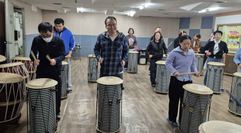 강사의 쿵쿵 짝찍 하는 소리에 맞추어 신나게 두드리며 한껏 신이나 있다.