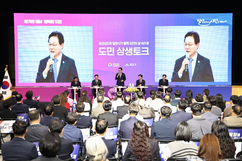 경상남도(도지사 박완수)는 31일 밀양문화체육회관에서 ‘도민 상생토크’를 개최하고, 도지사와 밀양시민이 마주 앉아 지역 현안과 정책 과제에 대해 진솔한 대화를 나눴다.