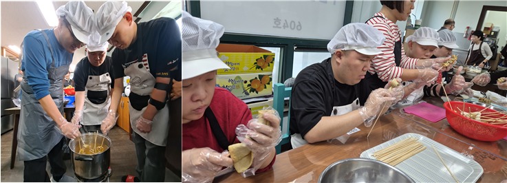 발달장애인들이 야채를 자르고 오뎅을 정성껏 접은 후 가래떡과 함께 꼬치에 끼운다.