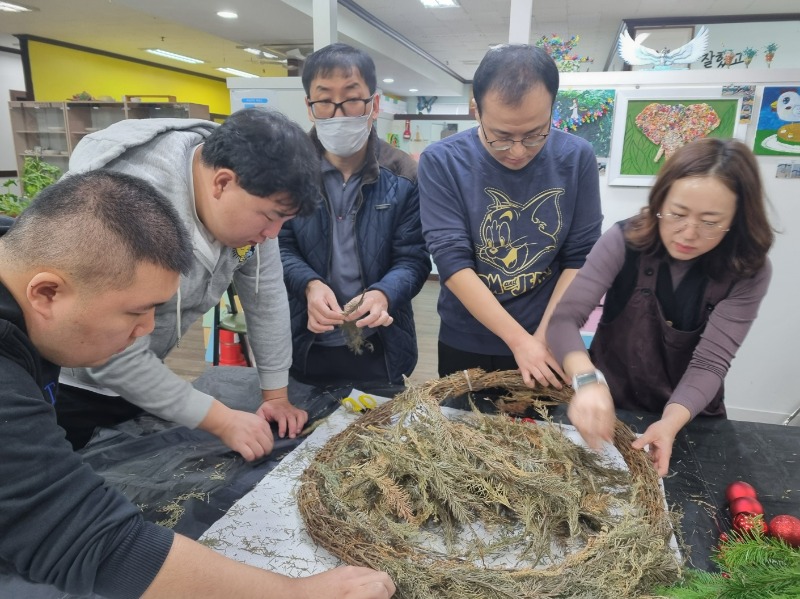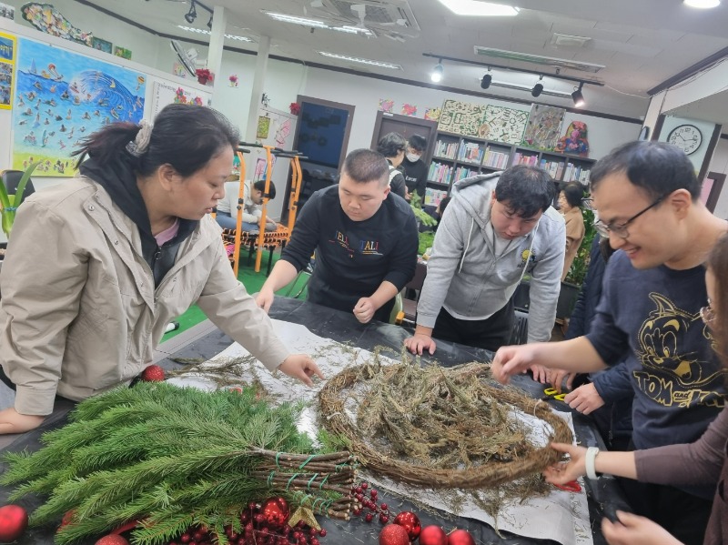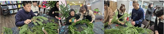 뜨레봄의 발달장애인들이 리스만들기 원예활동을 한다.