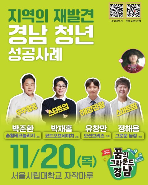 김성규 교육청년국장은 “이번 콘서트가 수도권 청년들의 고정관념을 바꾸고, 지역에서 성공하는 길을 보여주는 계기가 되길 바란다”라며, “청년이 찾아오고 머무는 경남, 꿈이 현실이 되는 경남을 만들어 가겠다”고 말했다.
