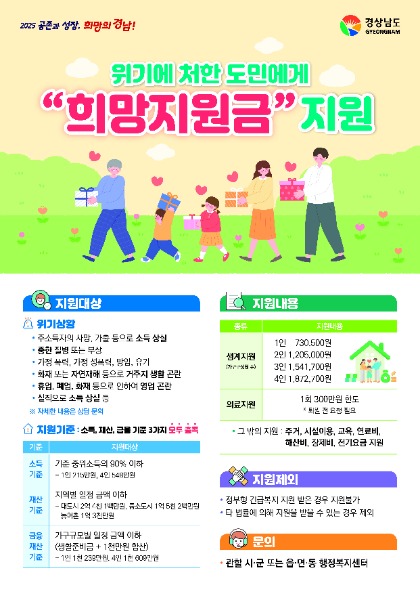 - 경남형 긴급복지 ‘희망지원금’ 올해 처음 도입 시행 중