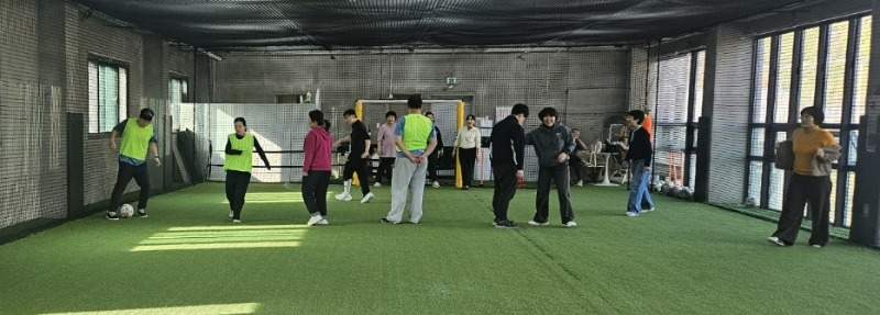 드리볼 솜씨를 자랑하며 패스 연습을 하며 두편으로 나누어 풋살경기를 펼친다.