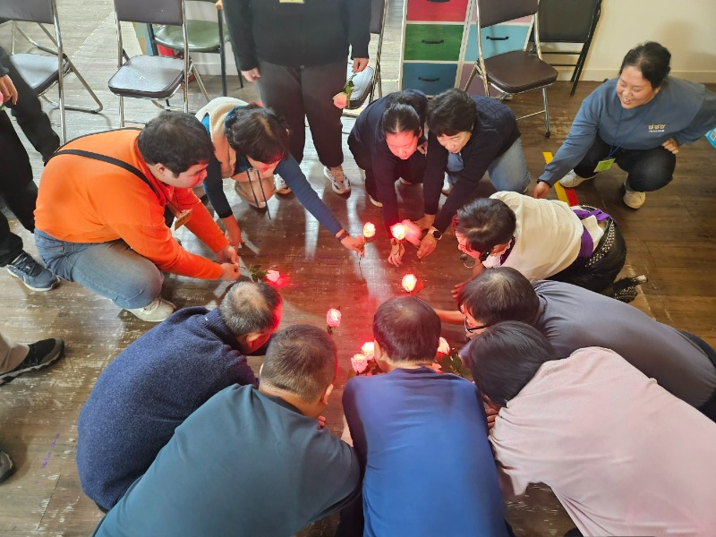 함께 모여진 꽃들이 발달장애인 모두가 "켜져랴" 며 마술을 펼치자 불이켜지며 꽃이 피어난다.