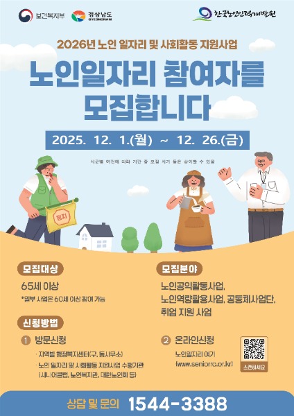 경상남도는 어르신의 활기차고 건강한 노후생활을 위해 ‘2026년 노인일자리 및 사회활동 지원사업’ 참여자를 모집하고 있다고 밝혔다.