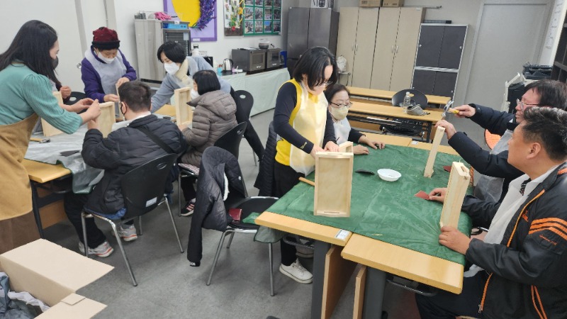 경남조은장애인평생학교 학생들은 1교시 미술심리치료 수업 후 2교시 목공예 시간에 우드 트레이를 만들어보았습니다. 트레이 조각을 끼워맞추고 못으로 박아 고정시켜주었습니다. 트레이를 사포로 부드럽게 갈아서 만졌을때 부드러운 느낌이 날수 있도록 날카로운 부분을 문질러주었습니다. 그런다음 원하는 색을 스펀지에 묻혀 발라주고 1차로 말려준 후 원하는 필름지를 가지고 와서 위에 물감을 톡톡 찍어발라줍니다. 완전히 말려준 후 바니실을 발라 코팅해주었습니다. 실용적이고 즐거운 목공예 시간이었습니다