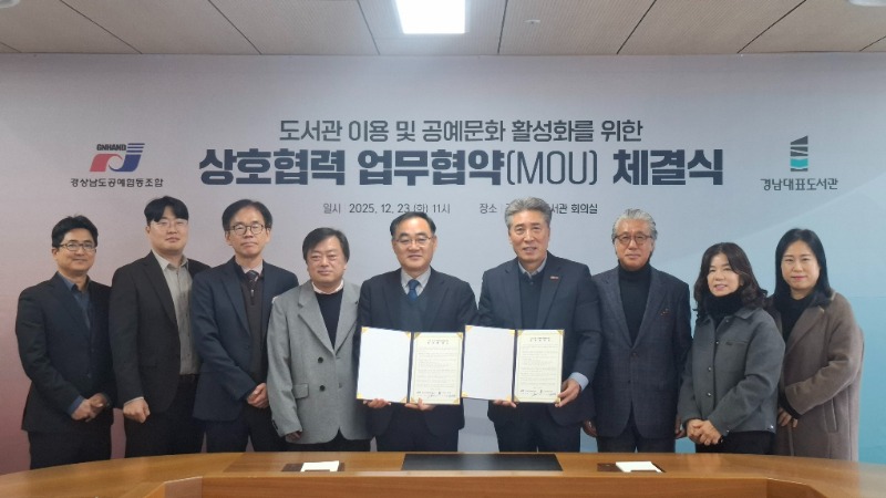 경남대표도서관(관장 강순익)은 23일 오전 11시 경남대표도서관 회의실에서 경상남도공예협동조합(이사장 허일)과 도민의 공예문화 향유 기회 확대 및 도서관 이용 활성화를 위한 업무협약을 맺었다고 밝혔다.
