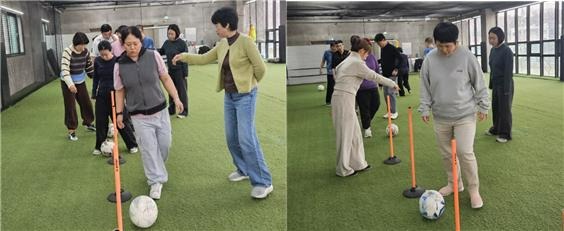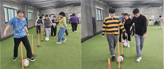 발달장애인들은 풋살공을 차며 요리조리 장애물을 넘으며 모두가 열심이다.
