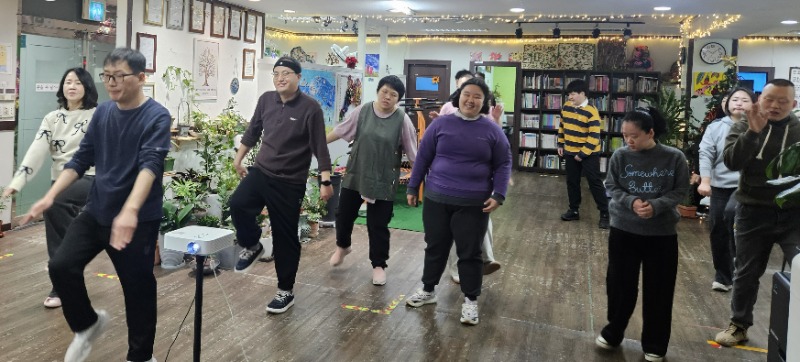 발달장애인들이 유산소운동을 함께 한다.