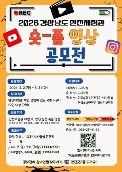 경상남도 소방본부(본부장 이동원)는 체험형 안전교육의 효과를 지속하고 도민 참여형 안전 문화를 확산하기 위해 경상남도 안전체험관에서「체험활동 기반 안전 실천 숏폼 공모전」을 개최한다고 밝혔다.