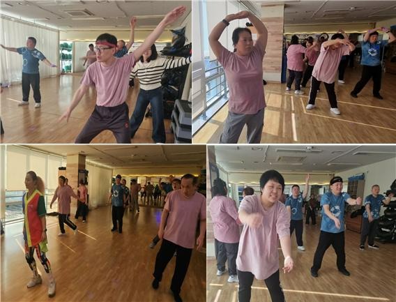 뜨레봄의 발달장애인들이 팔을 벌려 흔들며 강사의 움직임을 열심히 따라 하며 벅찬 숨을 몰아쉰다.