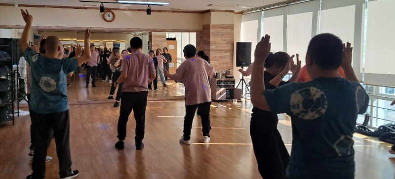 연속되는 필록싱을 열심히 따라하며 바쁘게 움직이지만 얼굴엔 웃음이 가득하다.
