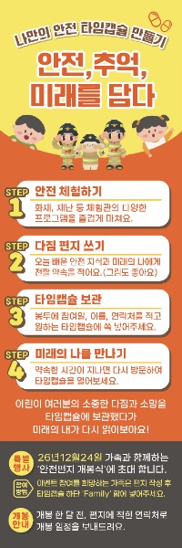 ‘어린이 안전 타임캡슐’은 화재, 지진 등 재난 상황을 주제로 활동한 뒤 ‘미래의 나에게 보내는 안전 다짐과 소망 편지’를 작성해 타임캡슐에 보관하는 방식으로 운영된다. 편지에는 어린이의 안전 다짐과 소망뿐만 아니라 부모의 격려 메시지도 함께 담을 수 있어 가족 단위 참여가 가능하다.