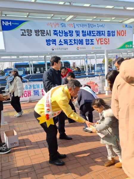 경상남도는 민족 최대의 명절인 설을 앞두고 귀성객과 도민을 대상으로 가축전염병 유입과 확산을 막기 위해 ‘설 명절 가축방역 민·관 합동 홍보 캠페인’을 진행했다고 밝혔다.