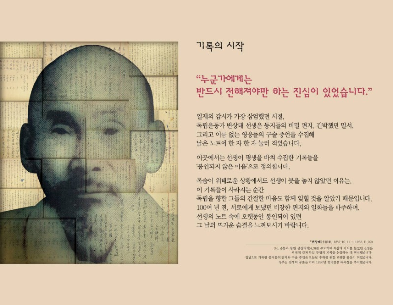 이번 전시는 3·1 독립운동의 산증인이자 기록자였던 변상태 선생*과 그 유산을 이어받아 『경남독립운동소사』를 집대성한 아들 변지섭 선생의 2대에 걸친 헌신을 조명한다.