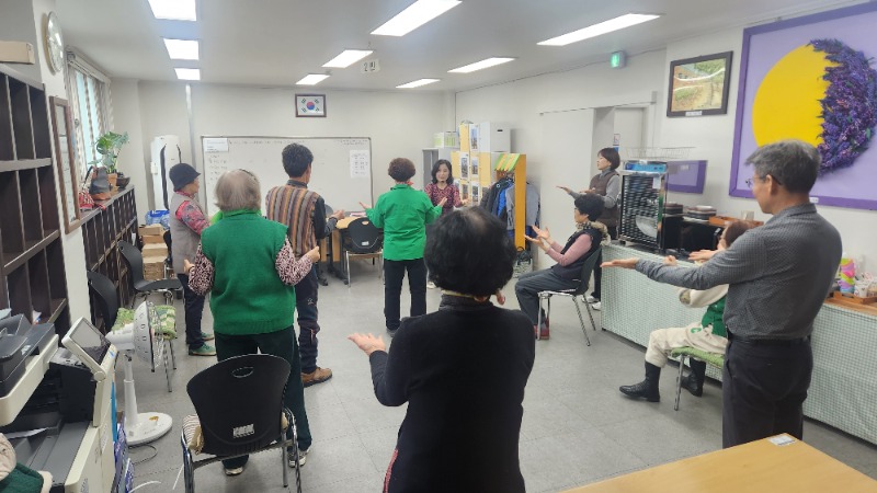 경남조은장애인평생학교 학생들은 실버댄스 시간에 다양한 스트레칭과 음악에 맞춰 손유희 동작을 해보았습니다. "장미꽃한송이" 노래에 맞춰 손박수(건강박수)를 쳐보고 "시계바늘" 음악에 맞춰 준비운동을 해보았습니다. 다음으로 "못찾겠다 꾀꼬리" 노래에 맞춰 뭉친 어깨를 풀어주고 다양한 근력운동을 하며 실버댄스를 해보았습니다. 실버댄스는 26년도 새롭게 도입된 프로그램으로 흥겨운 음악에 맞춰 리듬을 타고 스트레칭을 하면서 손유희 동작도 함께 하는 프로그램이다보니 시간가는줄 모를만큼 학생들의 반응이 뜨거웠던 시간이었습니다. 간단한 운동이지만 모두 열심히 하면서 즐거운 시간을 보내도록 해봅시다. 모두들 수고하셨습니다.