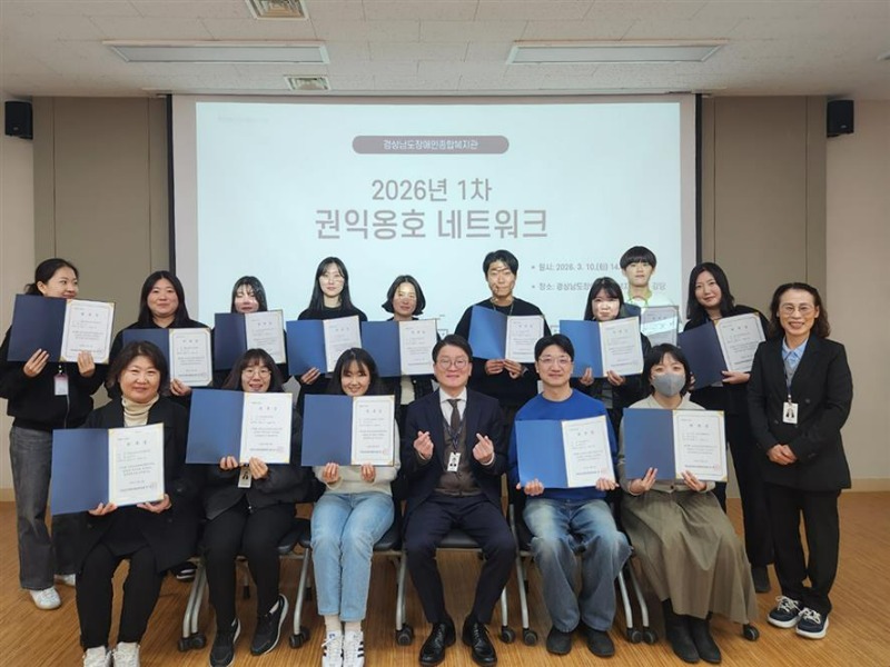 (재)경상남도사회서비스원(원장 조철현) 경상남도장애인종합복지관은 경남 지역 장애인 권익옹호 협력체계 강화를 위해 「2026년 권익옹호 네트워크 1차 회의」를 3월 10일 개최하였으며 이번 회의에는 도내 장애인 권익옹호 관련 15개 기관에서 총 19명의 실무위원이 참여했다.