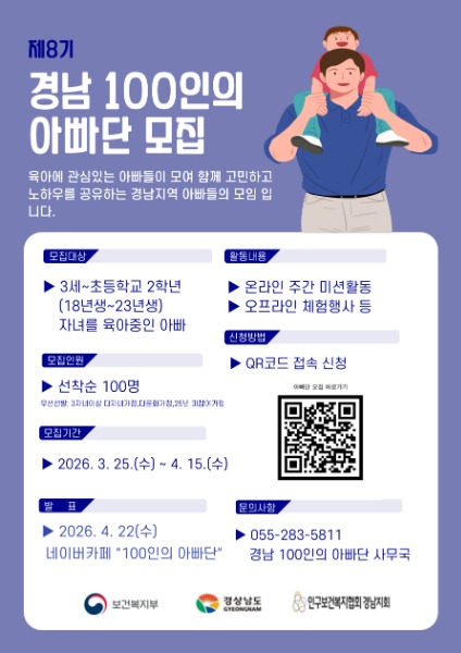 경상남도(도지사 박완수)와 인구보건복지협회 경남지회(회장 윤성미)는 아빠의 육아 참여 확대와 가족친화적 양육 문화 확산을 위해 ‘경남 100인의 아빠단’ 8기를 모집한다.