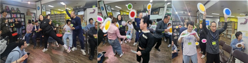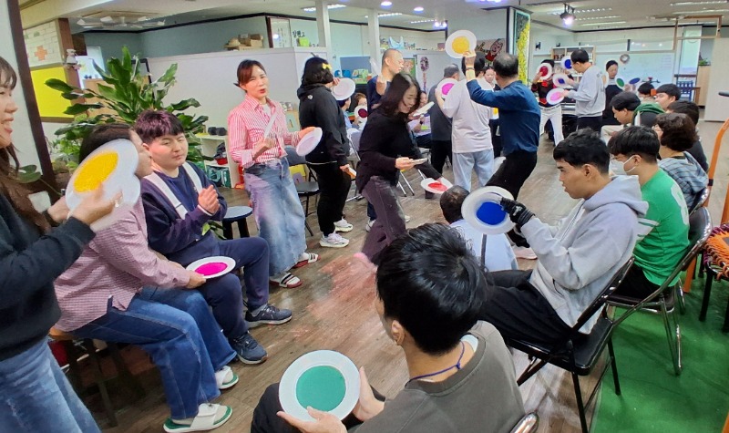 접시를 활용하여 발달장애인들이 힘차게 박수치며 장고팀, 북팀, 쾡가리팀, 징팀 으로 나누어 각자의 역할을 하며 돌아가며 신나게 노래를 부르며 사물놀이를 즐기며 모두 하나가 되어 즐거움을 함께 했다.