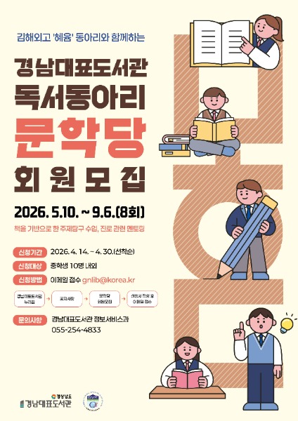 경남대표도서관(관장 강순익)은 김해외국어고등학교 교육나눔동아리 ‘혜윰’과 함께 도내 중학생 대상 독서동아리 ‘문학당’을 운영하고, 참여 학생을 4월 14일부터 30일까지 선착순 10명을 모집한다고 밝혔다.