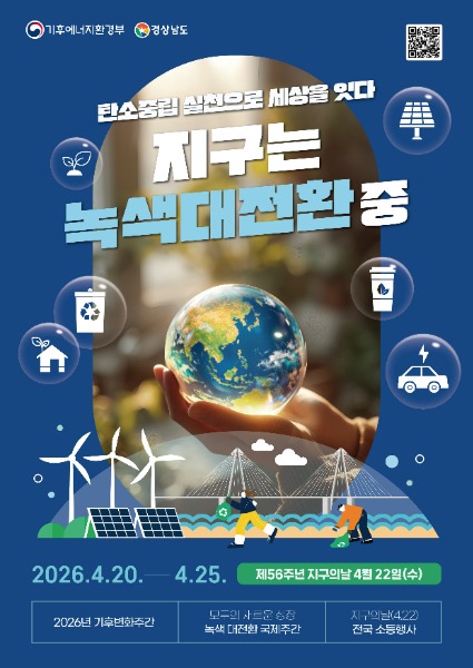 경상남도(도지사 박완수)는 56주년 ‘지구의 날’을 기념해 탄소중립에 대한 도민 인식을 높이고 생활 속 실천 문화를 확산하기 위해 20일부터 24일까지 5일간 ‘제18회 기후변화주간’을 운영한다고 밝혔다.