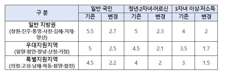 그 외 시간대에는 기존 ‘경남 패스’ 혜택(일반 20%, 청년‧ 2자녀부모‧ 65세 이상 어르신 30%, 3자녀 이상 부모 50%, 저소득층 100%, 75세 이상 100%)이 그대로 유지된다.