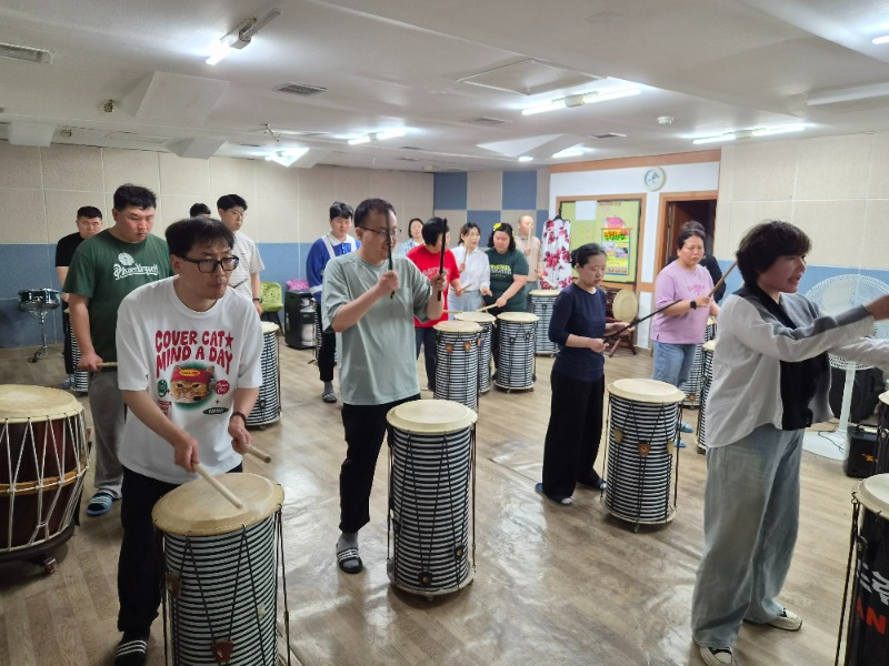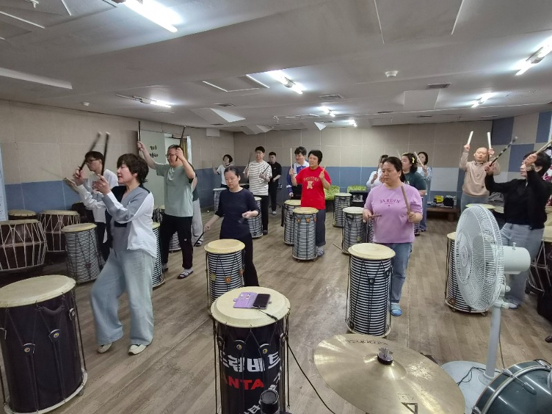 강사의 쿵쿵 짝찍 하는 소리에 맞추어 신나게 두드리며 한껏 신이나 있다.
