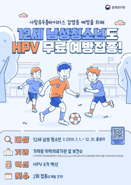 - 5월 6일부터 12세 남성 청소년(2014년생) 국가예방접종 지원 신규 포함