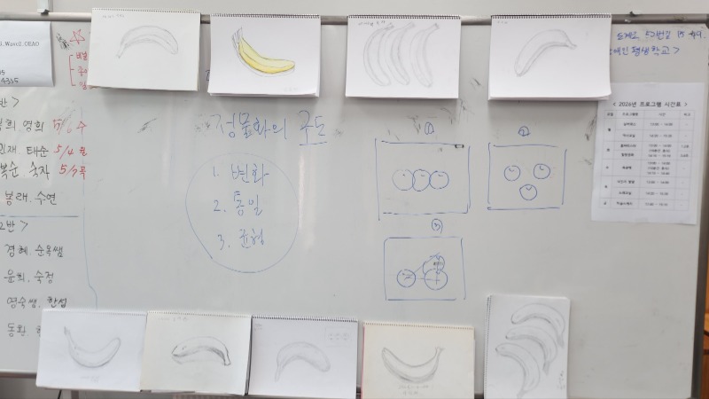 경남조은장애인평생학교 학생들은 미술스케치로 직접보고 그리는 시간을 가져보았습니다. 실물 바나나를 이용하여 실제크기로 그림을 그려보았습니다. 바나나를 잘 관찰하며 하나하나 그림을 그려나가는 학생들입니다. 바나나의 생김새를 둥글게 먼저 그리기보다는 일단은 네모모양의 직사각형을 만들어 큰 틀을 잡은 후 그 안에서 바나나의 형태를 잡아보았습니다. 바나나의 곡선의 형태를 천천히 따라 그리며 바나나를 완성시켜보았습니다. 그 다음 색연필을 이용하여 바나나의 색을 입혀주었더니 실물과 닮은 바나나 스케치가 완성되었습니다. 우리가 흔히 자주 먹는 바나나를 이용하여 스케치를 해보니 훨씬 더 재밌고 즐거웠던 시간이었습니다.