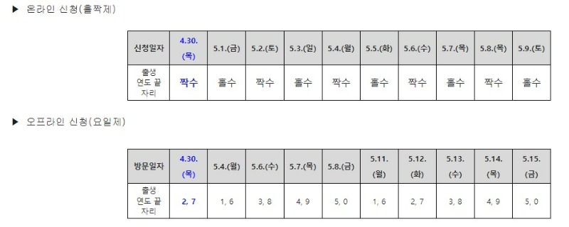 - 방문신청은 출생연도 끝자리 요일제 적용, 4. 30일은 2·7번 대상/온라인은 홀짝제