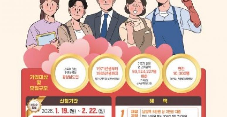 ‘경남도민연금’ 가입자 본격 모집... 1월 19일 시작 - 1월 19일부터 2월 22일까지 ‘경남도민연금.kr’에서 가입자 모집- 1971~1985년생 경남도민 대상, 연소득 9,352만 원 이하·IRP 가입 가능자- 누리집 온라인 신청... NH농...