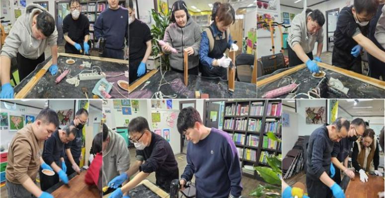 발달장애인들이 DIY체험 활동 하며 책상만들기에 매진한다.목재를 사포로 문지르며 책상 상판과 다리에 예쁘게 색칠하기를 반복하여 정성을 다한다.같은색이지만 다르게 보이는 곳에는 고운사포로 문지른후 다시 색을 칠한다. 발달장애인주간활동센터 뜨레봄은 목재를...