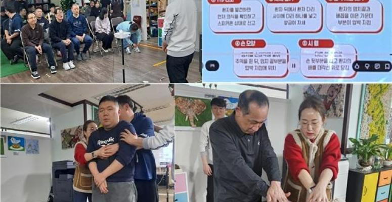 발달장애인들이 영상을 보고 직접 체험활동을 통해 안전교육을 실습하고 있다.발달장애인들이 하임리히법을 배우며 인형을 활용하여 인형의 가슴을 양손으로 누르며 심폐소생술을 체험한다.발달장애인주간활동센터 뜨레봄은 발달장애인을 위한 안전교...