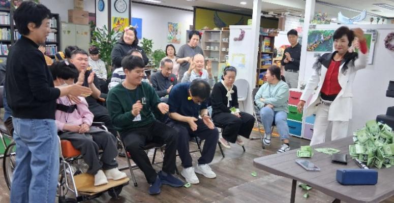 뜨레봄의 발달장애인들이 마술활동 프로그램을 통해 다양한 체험을 접한다.마술사가 지폐를 이용하며 마술을 펼치자 발달장애인들이 커다란 박수를 보낸다이어서 신문을 곱게 접어 가위로 자르며 하트만들기를 함게 배우며 함박웃음을 전한다.발달장애인주간활동센터 뜨레...